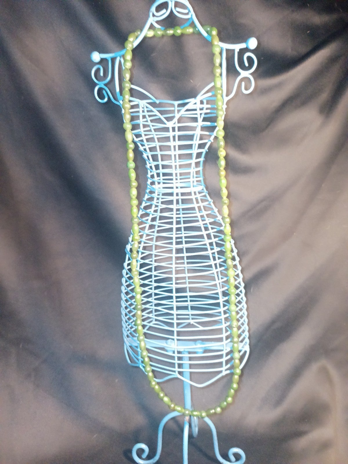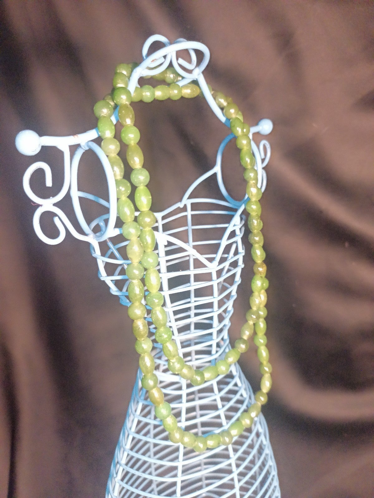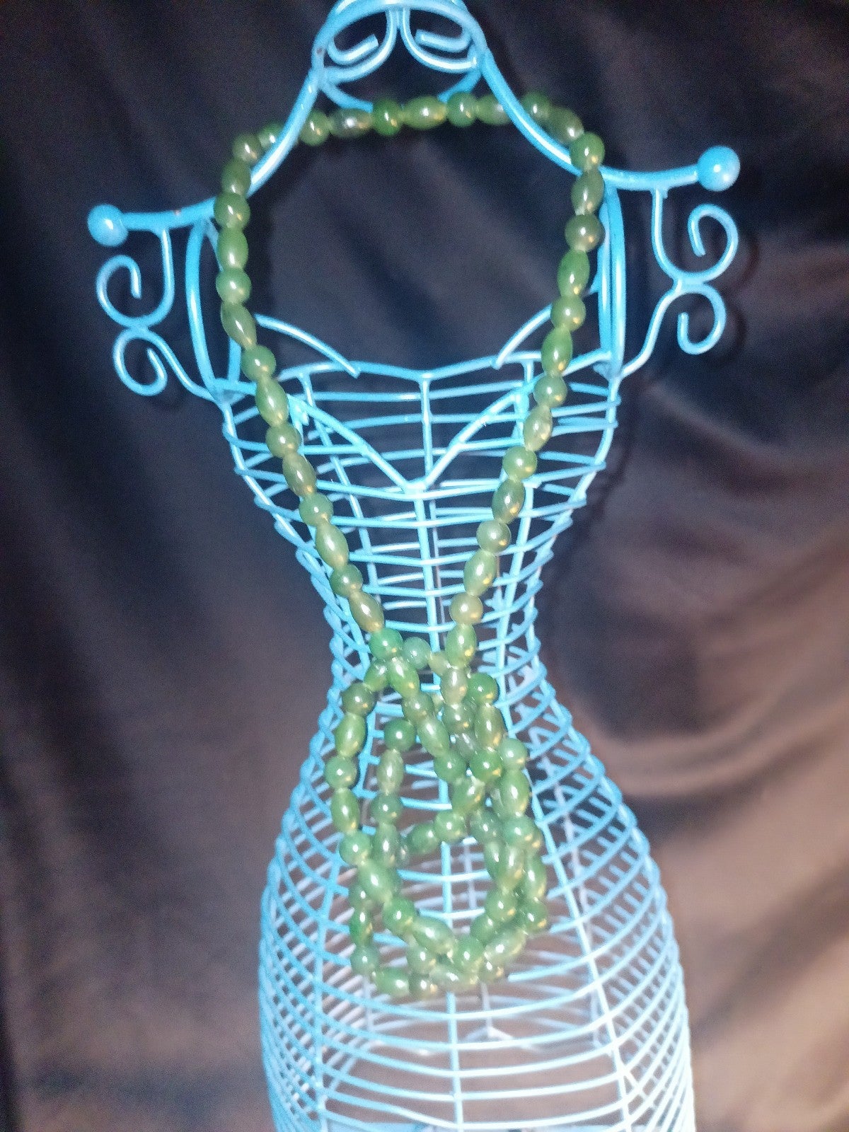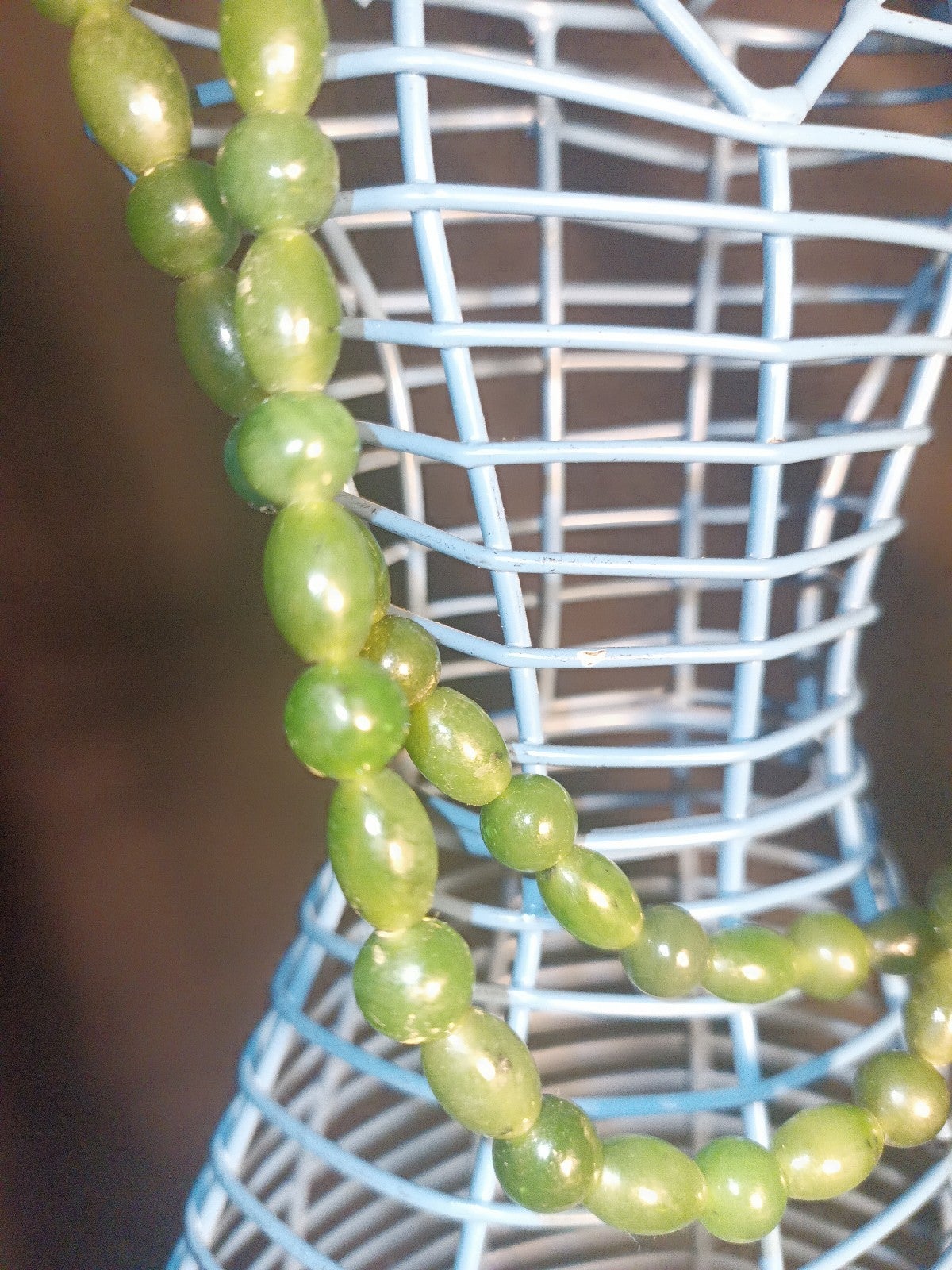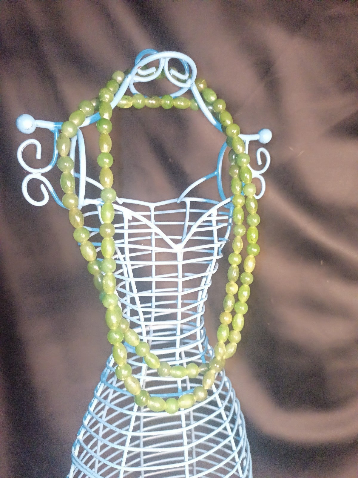 This gorgeous set of real mmmJade beads has been in my family for a long time. There are two sizes of beads and different shapes. It's kind of heavy because it's real jade. Very cold to the touch. The beads are knotted in-between each other on fine silk. Very beautiful set. Most definitely eye catching.