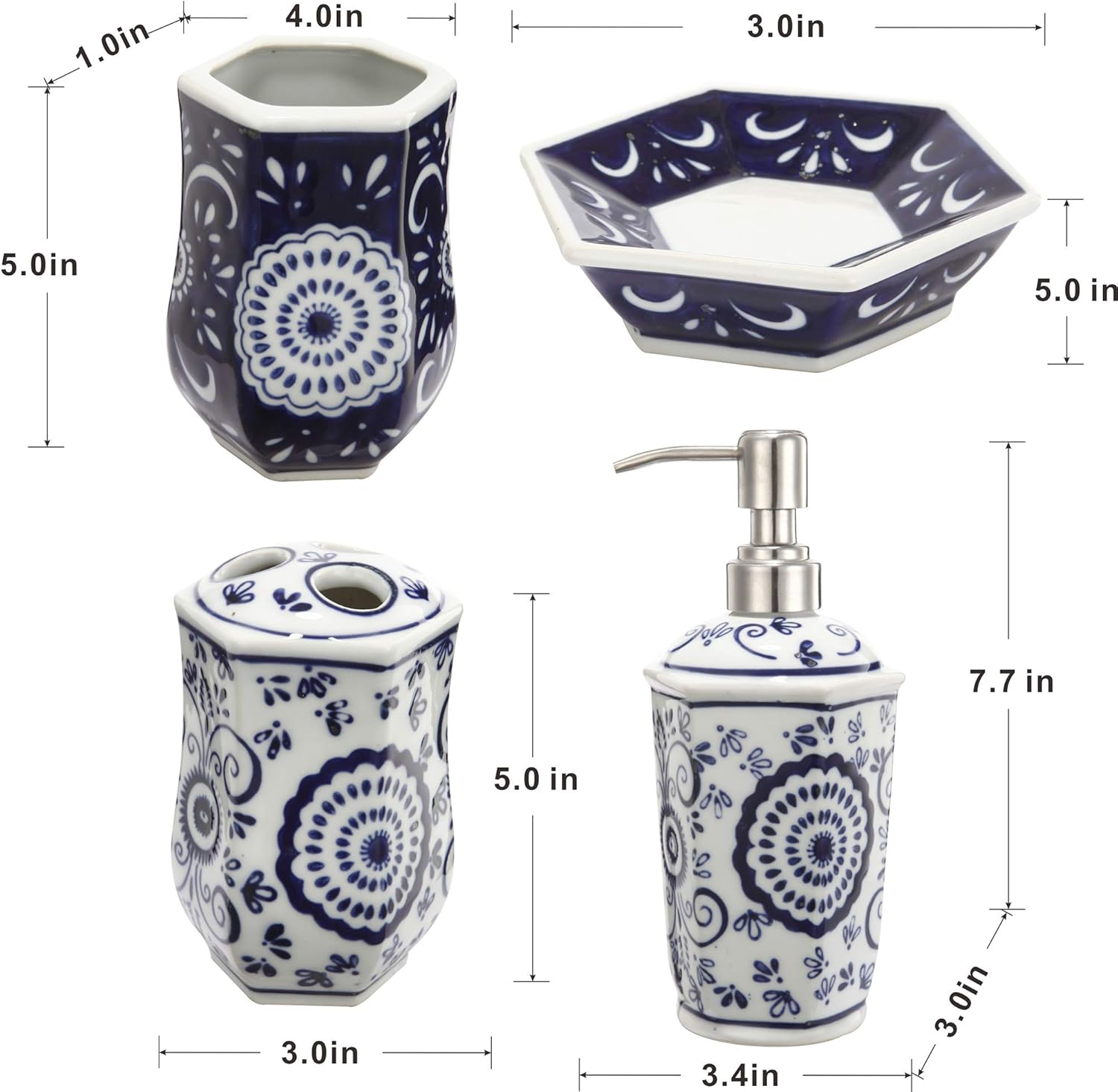 • Measurement:Lotion Pump:3.4x3x7.7,Toothbrush Holder:3x3x5,Cup:5x4x1,Soap Dish:3x3x5(Inches)<br>Weight:2.1lbs