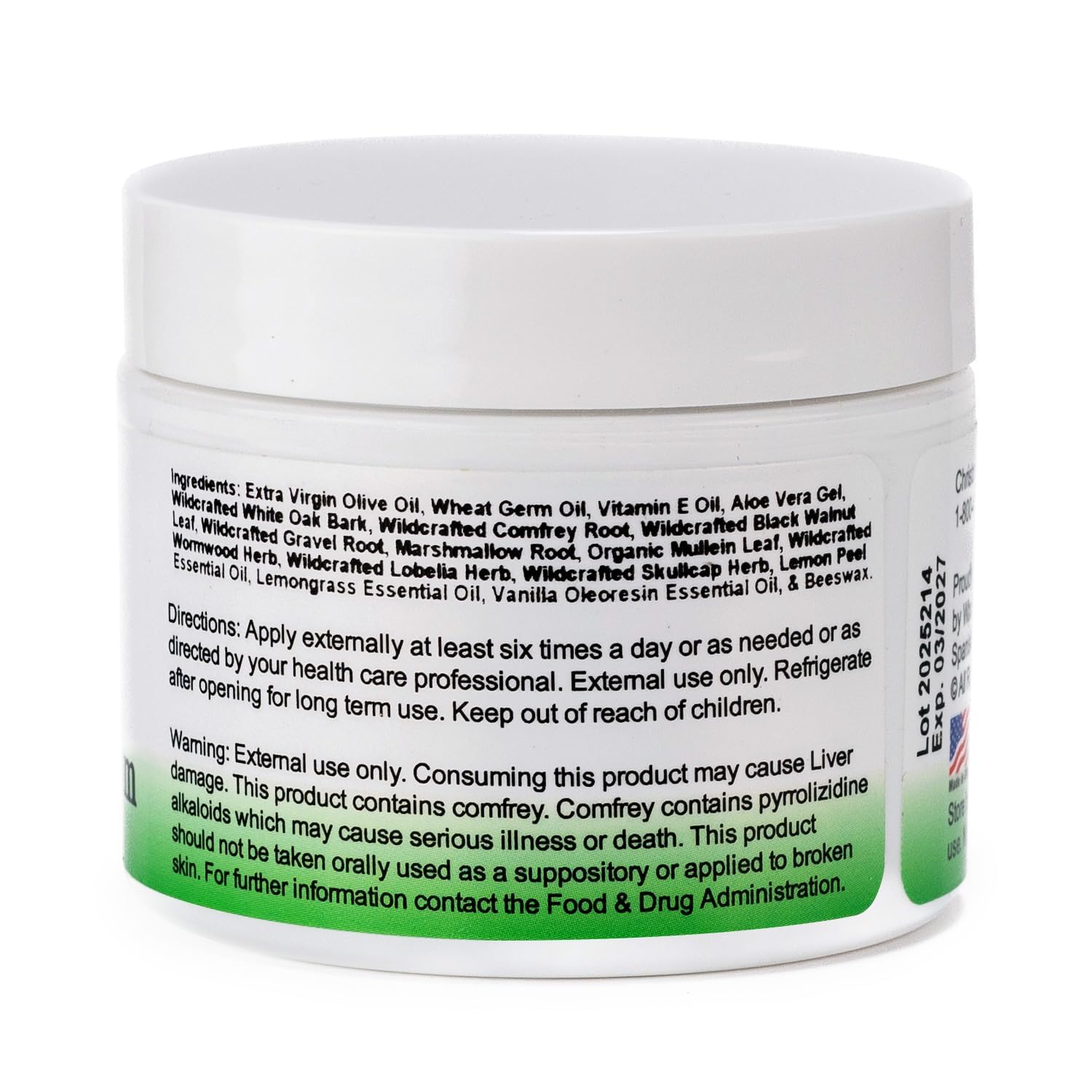 | Active Ingredients | Extra Virgin Olive Oil, Wheat Germ Oil, Vitamin E Oil, Aloe Vera Gel, White Oak Bark, Comfrey Root, Black Walnut Leaf, Gravel Root, Marshmallow Root, Mullein Leaf, Wormwood Herb, Lobelia Herb, Skullcap Herb, Lemon Peel Essential Oil, Lemongrass Essential Oil, Vanilla Oleoresin Essential Oil & Beeswax. |