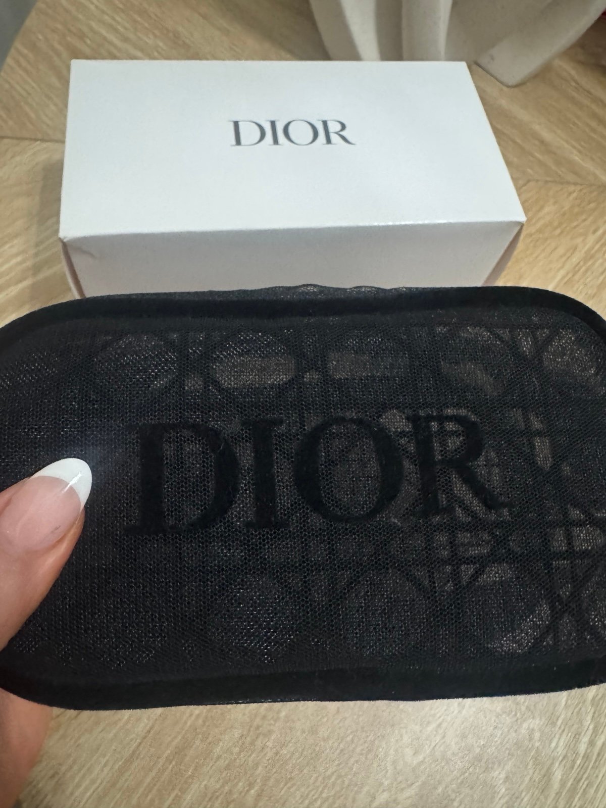 This chic black mesh Dior pouch is perfect for storing makeup, skincare, or travel essentials. Features the Dior logo detail and comes with the original Dior box.