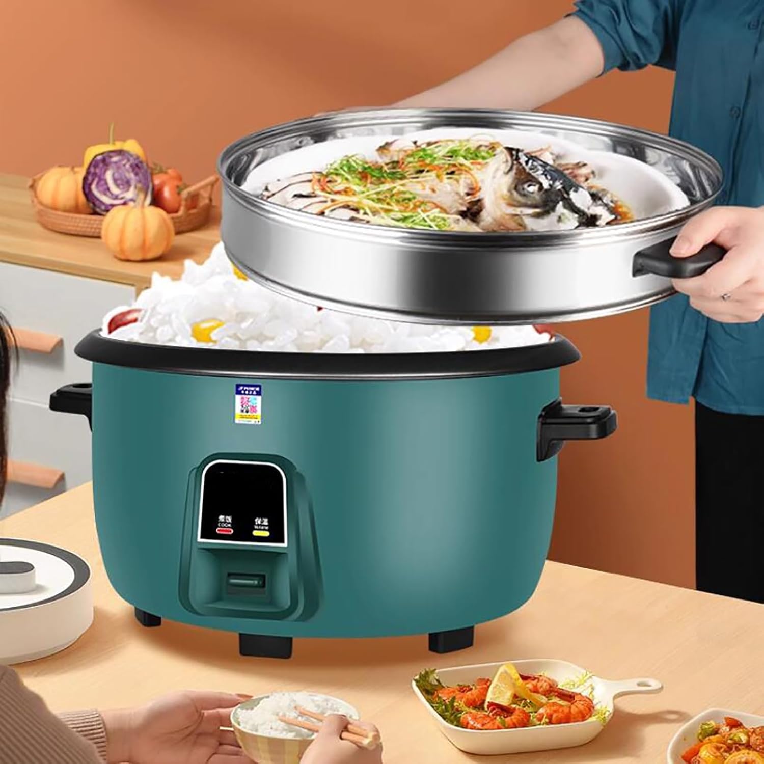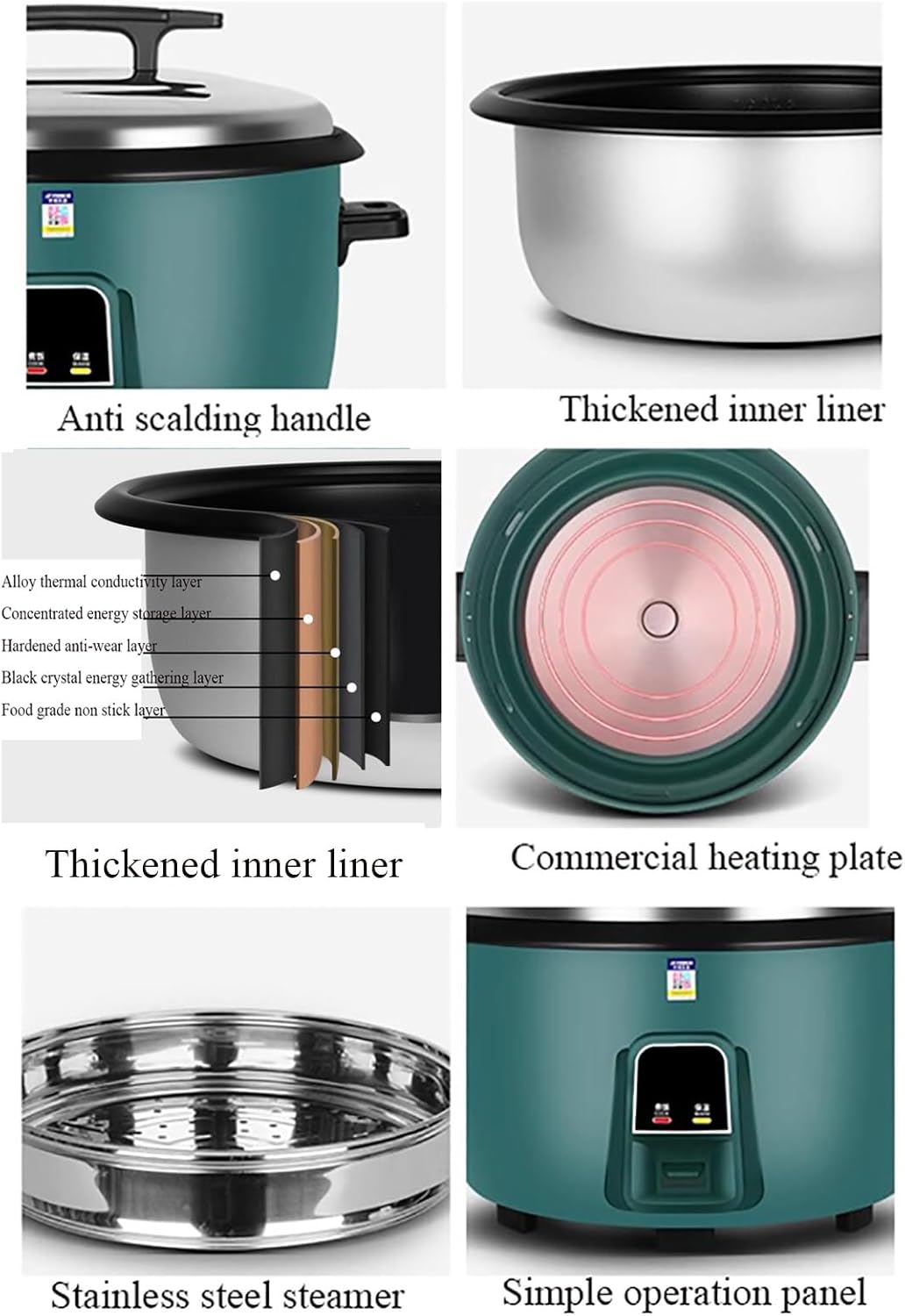 Name: Rice CookerHeating method: chassis heatingControl method: mechanicalLiner material: black gold non-stick linercapacity:8L-1300W : suitable for 8-12 people10L-1600W : suitable for 10-15 people, 10A socket13L-2000W : suitable for 15-20 people, 10A socket18L-2500W : suitable for 20-25 people, 10A socket23L-3000W : suitable for 30-35 people, 16A socket28L-3500W : suitable for 40-45 people, 16A socket36L-4000W : suitable for 50-60 people, 16A socket45L-4500W : suitable for 60-70 people, 16A socket Function: rice, sushi rice, porridge, cake, egg, stew, etc.Tip: 1. The number engraved in the liner is not the size of the pot, it is the ratio of water to rice, please understand.2. Please don't worry about the voltage problem, we will give a local conversion plug according to your address.