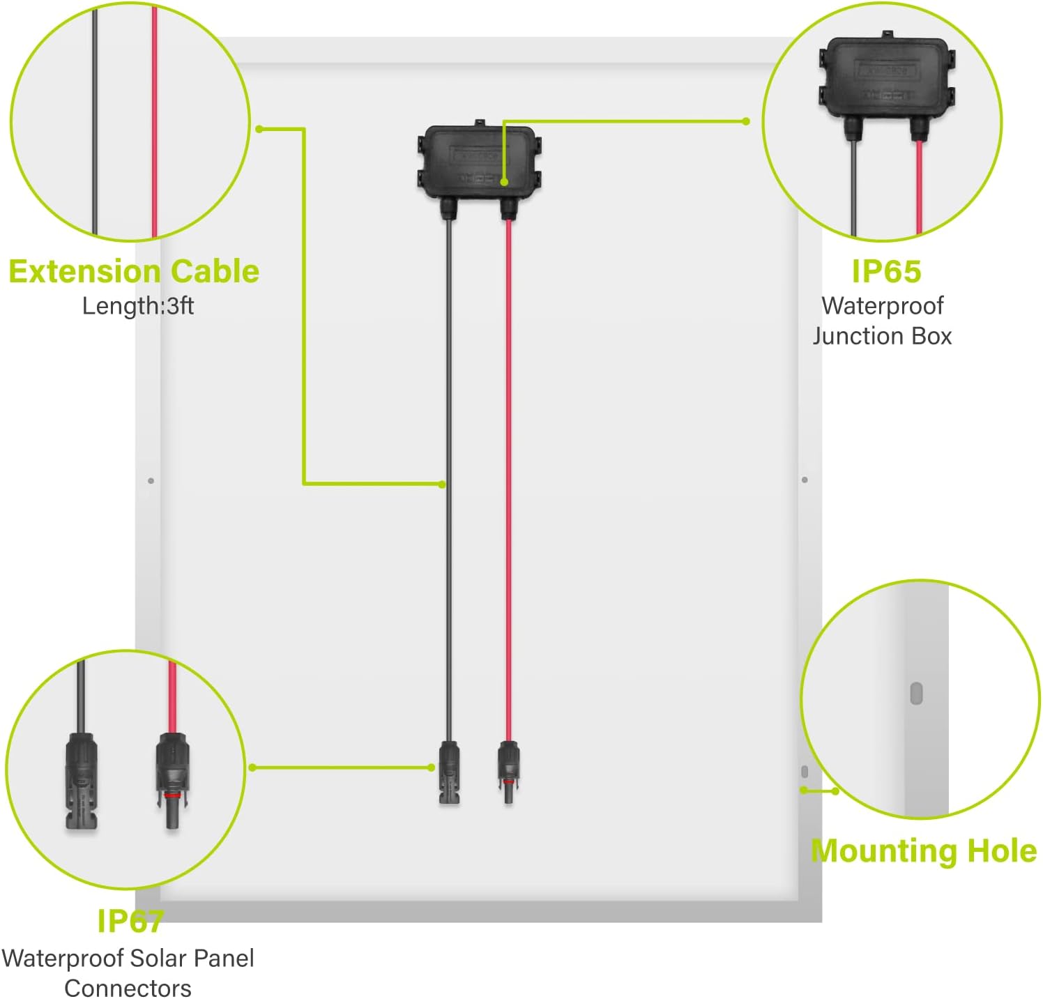 | Included Components | Pre-attached 3ft wire with connectors (M/F), Heavy-duty anodized frame, Pre-drilled holes for mounting, Possible mounting hardware, and Other components necessary for specific use-cases |