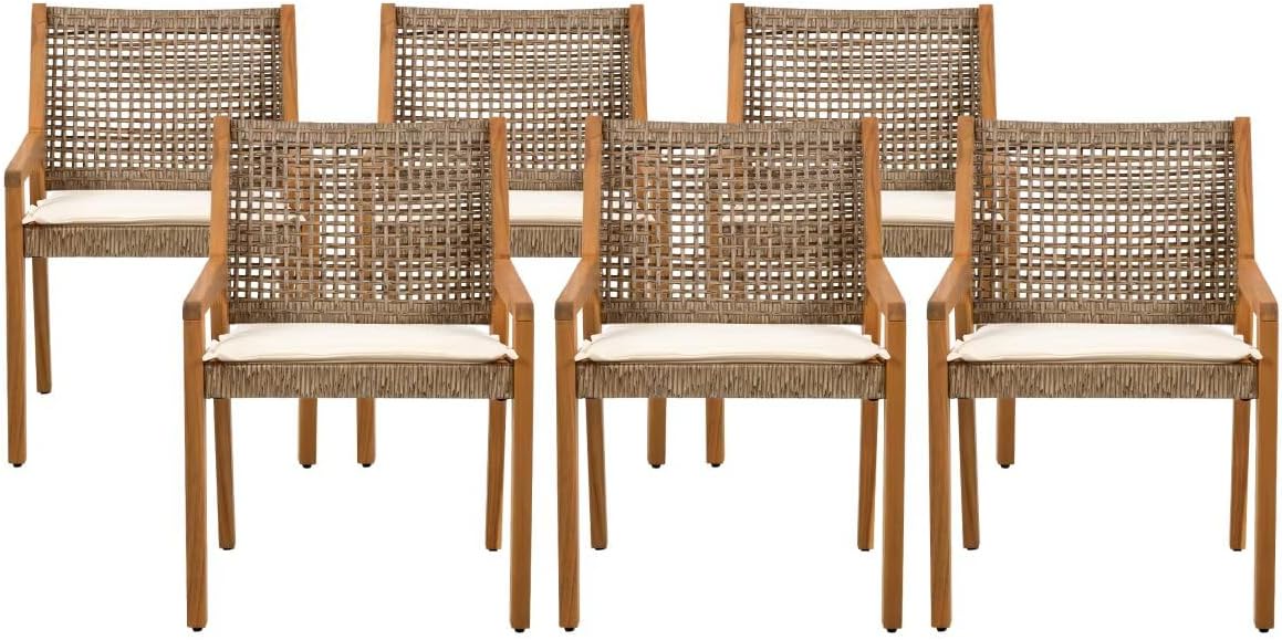 Outdoor Dining Set – Premium Acacia Wood Rectangle Table & Wicker Chairs with Cream Cushion for Lawn Garden Backyard, Suitable for Large Gatherings(1 Table + 4 Chairs)
