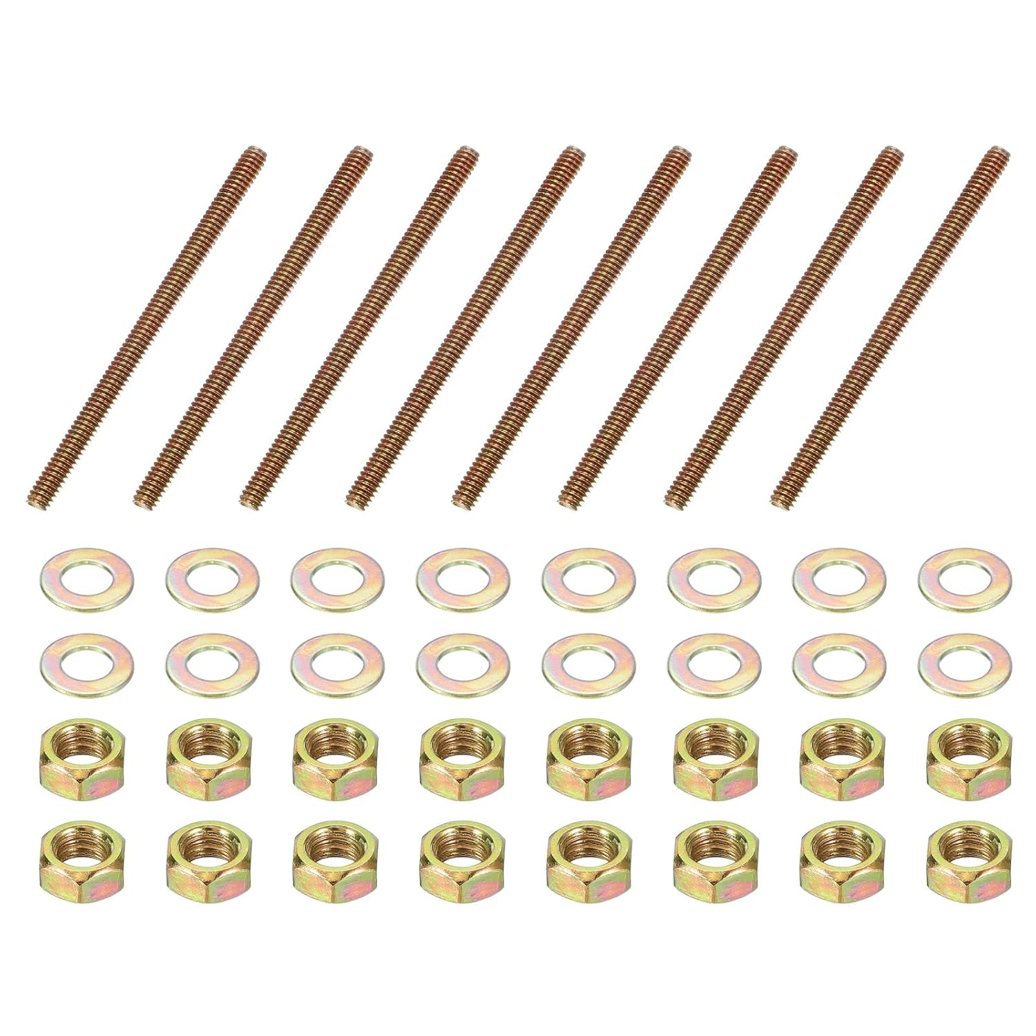 These threaded rods are suitable for furniture assembly including pet furniture, office furniture, household furniture, solid wood furniture and custom furniture. They work for wooden stairs, steel frame construction, iron furniture connections and garden railing installation. The rods are also good for outdoor furniture and various specialty furniture projects.SpecificationColor: Color ZincMaterial: Q235 Carbon SteelThread: 5/16-18.UNCThread Rod Diameter: 5/16 InchThread Rod Length: 3-1/4 InchWasher Diameter: 13 mm / 0.51 InchPacking List: 12 Pcs x Full Thread Rod, 24 Pcs x Washers, 24 Pcs x NutsAdvantageThese long threaded screws are made of carbon steel with a color galvanized coating for corrosion resistance and anti-rust protection. They feature standard inch threads that are smooth and burr-free for proper fitting with nuts and washers. The rods provide good strength and durability while ensuring secure fastening.InstructionSimply insert the color zinc threaded rods into matching nuts or threaded holes, and secure with washers when necessary.NOTE:Before choosing, verify that the rod diameter and length match your project requirements.