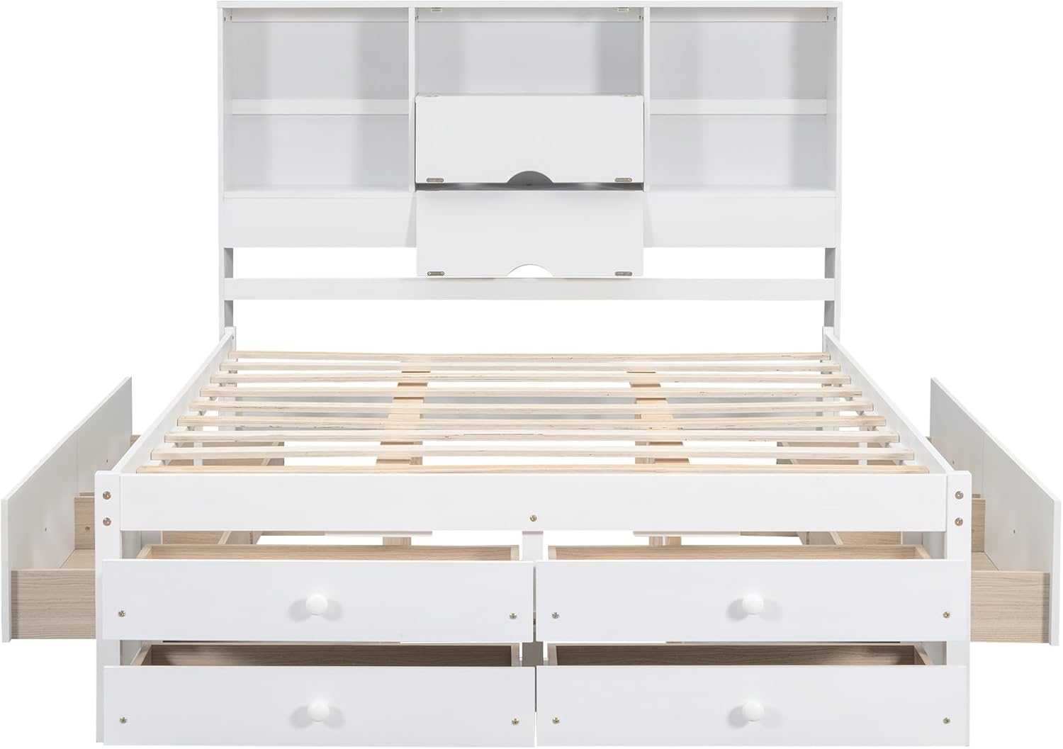 ๐กThis storage platform bed is simple and stylish. The headboard features 4 storage compartments with 8 drawers, providing you with convenient storage space for your daily essentials. The entire structure is made of solid wood and MDF, so it is designed for long-term use.DescriptionMaterial:Pine Wood+MDFSize:QueenColor:WhiteNumbers of Package:2Spring Box:No needAssembly Required:YesOrigin:VietnamDimensionsOverall Product Dimension:91.3''L x 64.3''W x 53.6''HQueen Bed:80.9'' x 61.2''Total Height:53.6''Number of Bed Slats:10pcsRecommend Mattress Thickness of Bed:6-10''Overall Product Weight:238lbsBed Weight Capacity:400lbsNotes:1. Manual measurement has been used, there may be some reasonable error.2. All the pictures are taken by actual samples, slight chromatic aberration may occur due to lighting or display
