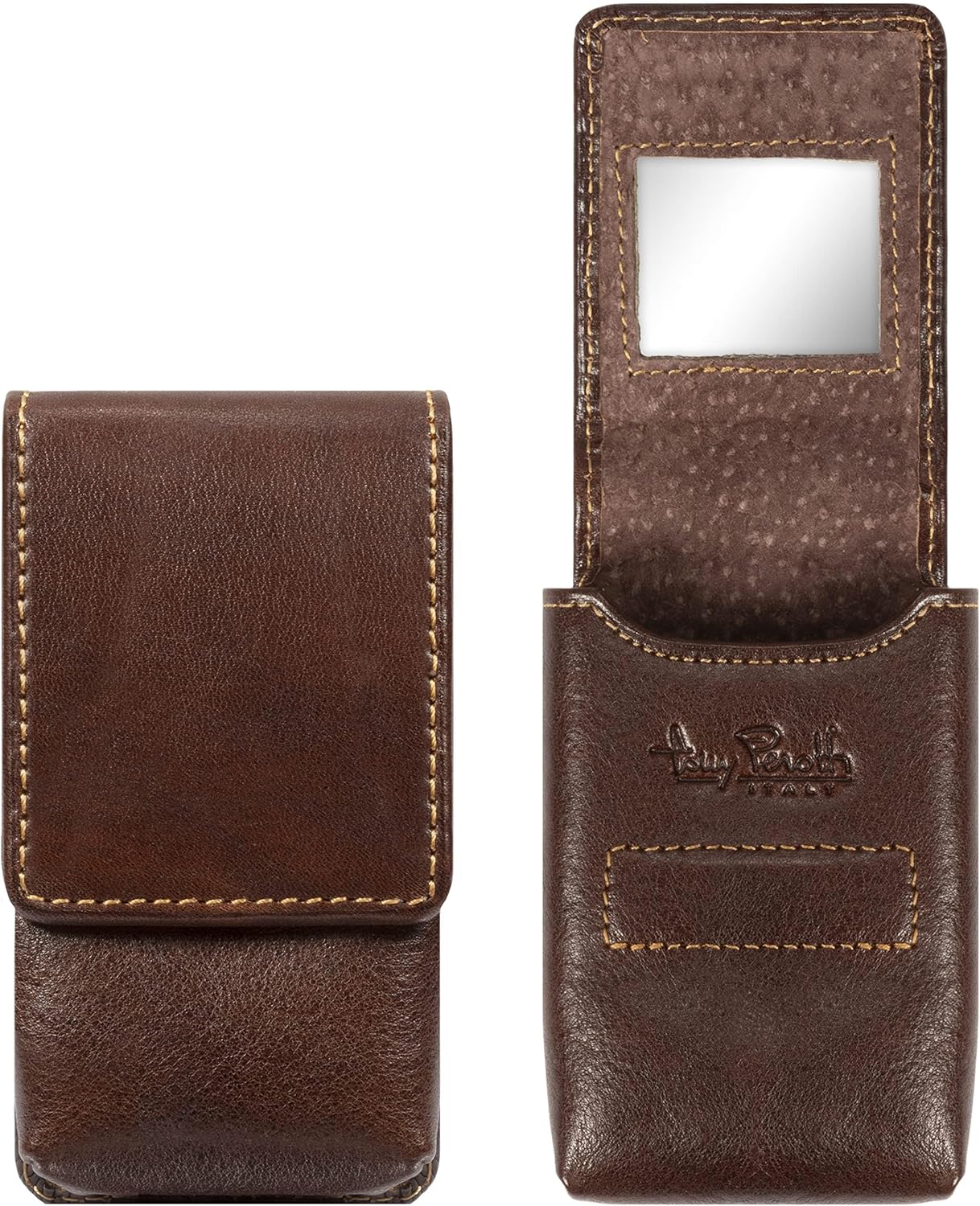 Tony Perotti Italy Fine Italian Craftsmanship - Luxurious Fashion Design - High Quality Function Since 1970 Tony Perotti has been constantly introducing styles that set future trends while maintaining a firm footing in the noblest Italian traditions of leather craft. All of our Tony Perotti products are made from carefully selected genuine Italian full grain hides, tanned in the most recognized expertise and leather craftsmanship based on ancient and noble Italian artisanship. The cool Italian weather prevents the animals attributing to the top quality and purity of the leather, devoid of any scratches or bites on the leather. The tanning process utilizes an eco-friendly approach by using vegetable extracts without the use of toxic or polluting substances. This vegetable tanning process allows the leather to retain its natural look and feel, as well as beautifying and maturing over time to develop a pleasant patina that gives the wallet an antique look as it gets older. It also allows the leather to be easily manageable and maintained, as the vegetable oils and dye can cover any scratches or marks on the leather by rubbing it off with a fine cloth or leather cleaning lotion.We are certain that you will love and appreciate our products. Thank you for being part of this tradition!SPECIFICATIONS:-100% Genuine Italian Leather-Interior Pigskin Lining- Stainless Steel Hardware-Double stitched seams- Lipstick CasePRODUCT FEATURES:- Magnetic closure- Mirror on the top flap-Dimensions: 3.75"(L) x 2"(H) x 1"(W). Weight: 0.25lbs